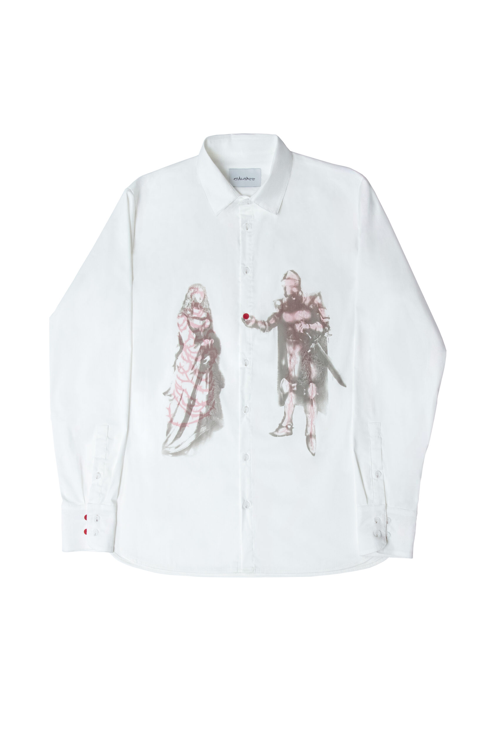 By combining a double-layered fabric covering the entire area of the shirt, along with prints and red buttons, a unique story can be recreated.